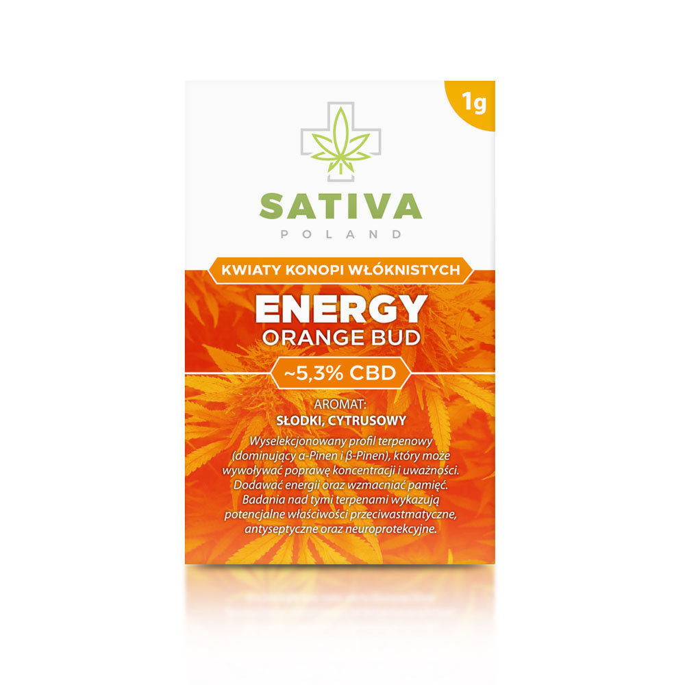Orange Bud konopi siewnych posiada ciemno zieloną barwę. Charakteryzuje się wyrazistym zapachem, w którym wyczuwalne są nuty słodkich cytrusów. Susz Orange Bud oprawiany jest przy wykorzystaniu metody indoor. Kwiaty tej odmiany zawierają średnio 5.3% CBD i mniej niż 0,2% THC.